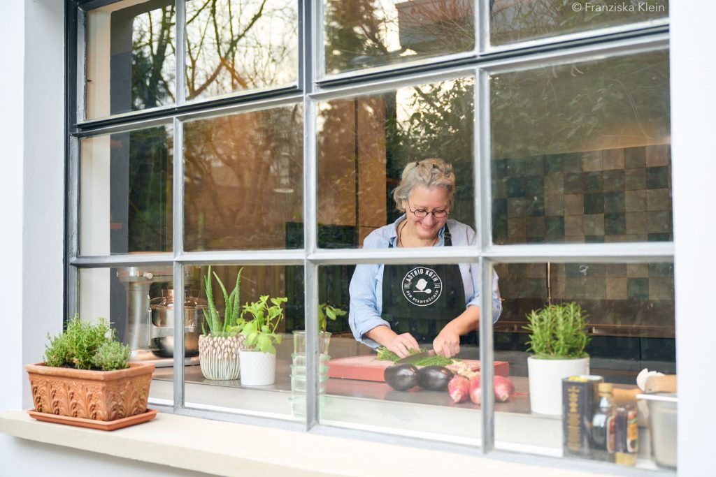 Oben, in der Römerstraße 179, habe ich ein großes, „begehbares Schaufenster“, wo ich meine Gäste empfangen kann, zum Aperitif, aber auch zum Schmökern (in einem Teil meiner Kochbuch-Sammlung) und zum Erzählen. Der Eingang in meine Küche ist aber „um die Ecke“: über den Gallierweg geht es hinein und so fühle ich mich fast schon ein bisschen wie Asterix ;).